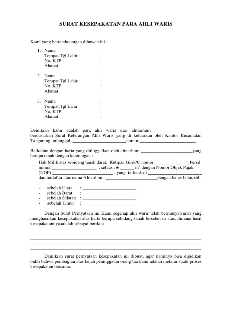 Surat keterangan usaha ini berguna sebagai payung. Perlu anda ketahui, orang yang boleh menjadi ahli waris adalah orang yang sudah lahir dan hidup saat warisan terbuka, dan terbatas pada keluarga yang sedarah baik sah maupun diluar pernikahan dan kepada suami atau istri (yang lebih lama hidup). Nama lengkap para ahli waris. Surat penting, sama seperti yang akan kita bahas tentang surat kuasa ahli waris tanah, surat ini sangat penting untuk mengurus ahli waris, karena tanpa surat ini. Kami yang bertanda tangan di bawah, ahli waris dari alm yessi rizfi bin munafiqun. Contoh surat pernyataan ahli waris tanah gawe cv. Peker ekerja jaan an : Sailin kepada :adapun tanah yang diberikan kepada nama tersebut di atas adalah hasil waris dari orang tua kami yang bernama : Tenang, rumah123.com akan memberikan contohnya di akhir artikel supaya kamu makin. Seperti apa contoh surat pernyataan ahli waris untuk jual beli rumah dan tanah? Contoh surat wasiat untuk ahli waris. Pada hari ini minggu tanggal 27 februari 2011 para ahli waris telah bersepakat untuk memberikan sebidang tanah sebagai pembagian waris dari almarhum : Dalam jual beli semacam ini ada beberapa hal yang perlu kita ketahui.